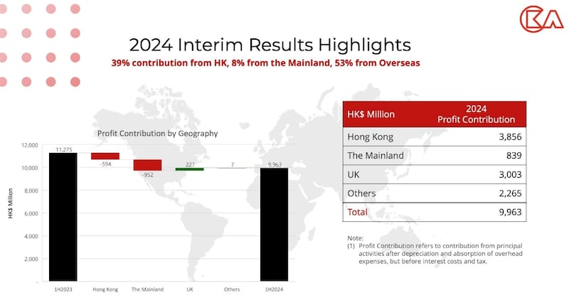 翻查長實剛公布的半年業績,按地域劃分,上半年收入主要靠英國和其他地區的業務推動,英國收入升8.24%至170億元,而盈利相比一年前,亦只有英國業務錄得增長,中港業務均錄得盈利下跌,令海外盈利佔比已達到53%,相反香港就攤薄至僅佔39%,反映長實的香港業務正在收縮。