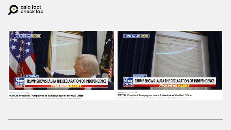 亚洲事实查核实验室(Asia Fact Check Lab, AFCL)以关键字查询,找到福克斯新闻网站上的相符影像,播出时间为2025年3月中。在福克斯新闻的原始影像3分28秒处,出现了和网传短视频高度相似的画面,特朗普向殷格拉汉展示挂在白宫办公室墙上的相框,但不同的是,特朗普拉开帘子后,相框里放的是《独立宣言》文件,字幕也写着「特朗普向劳拉展示独立宣言」。网传短视频的画面显然经过修改。